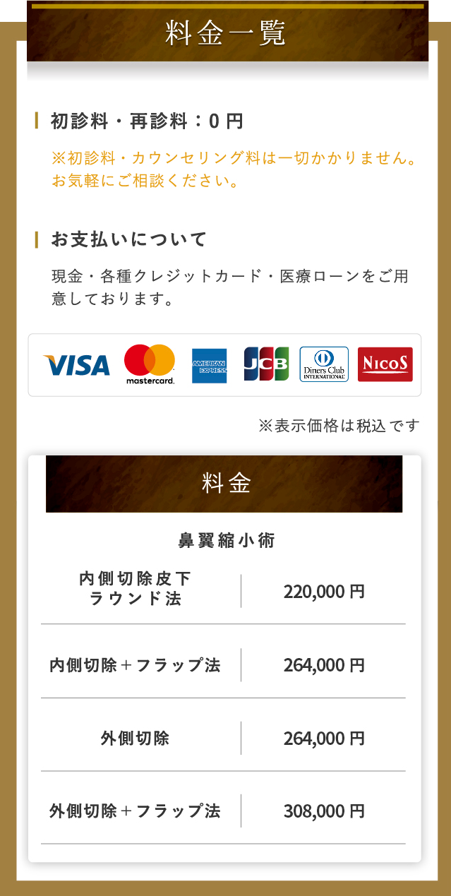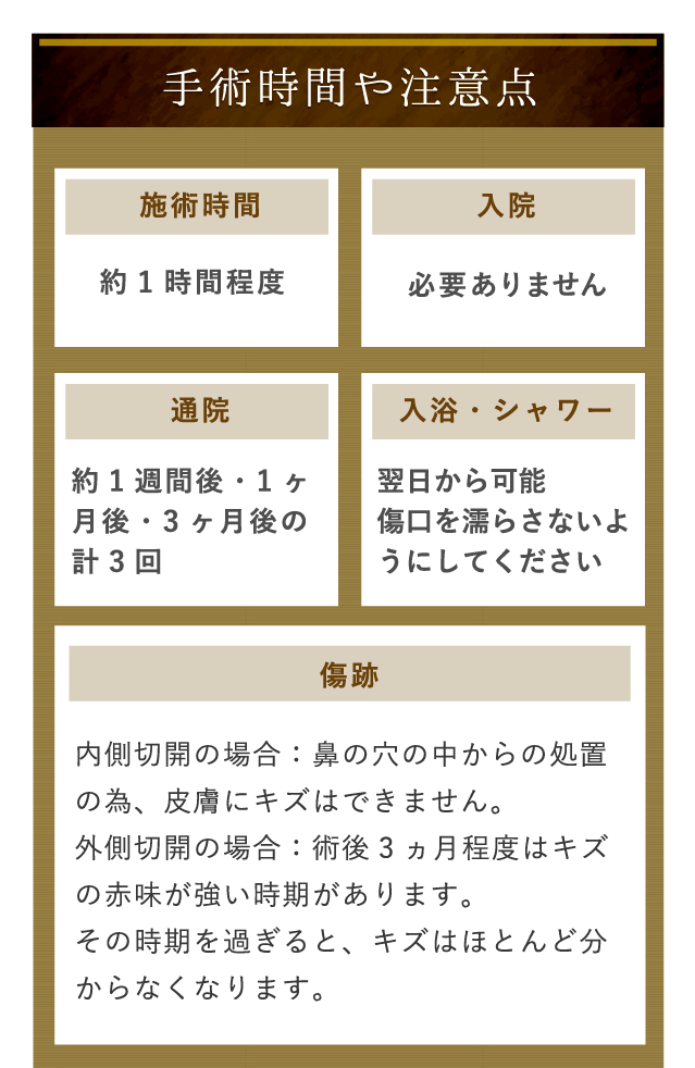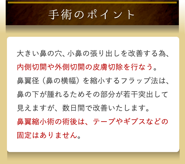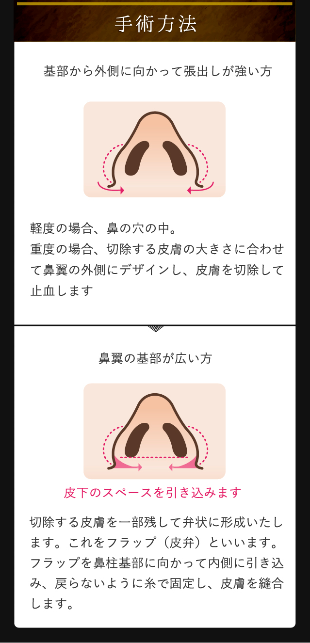 (3)鼻孔縁(鼻の穴のフチ)が上がっている、以上の場合が考えられます。(1)の場合は鼻翼縮小術:外側切開が適応になりますが、ご状態によってはフラップ法を併用するとより良い効果が得られます。
