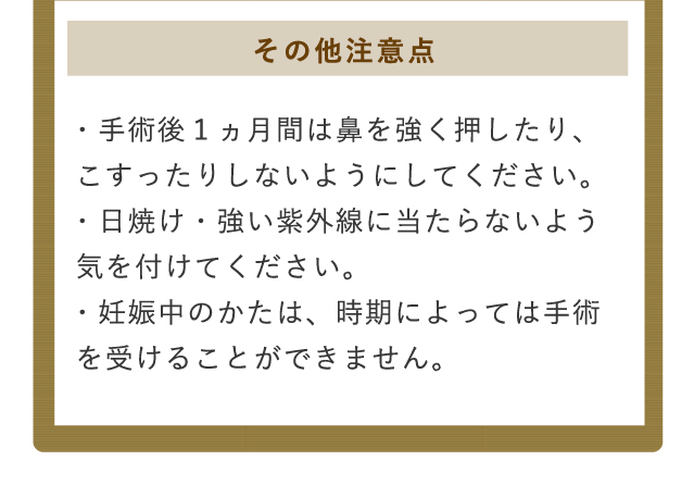 - フラップ法によって小鼻を絞り込んだ場合には、固定糸をはずすことによってある程度は鼻翼径(横幅)を元に戻すことができます。しかし組織を切除した場合は、原則として戻せないので、術前に切除幅を正確にデザインする必要があります。