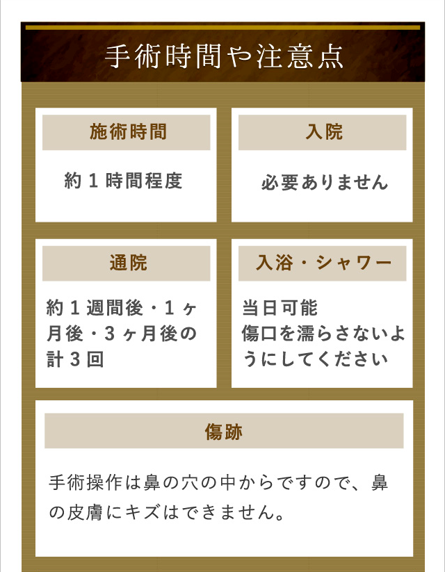 - 軟部組織には弾力性があるので、せっかく鼻先を細くしても、多少後戻りしてしまうことがあります。手術後のテープやギプスによる固定はこの後戻りを防ぐためのものですので、良い結果を維持するためには必要な処置になります。しかしご状態によっては、ギプスはしないでテープ固定のみを短期間行なう場合もあります。