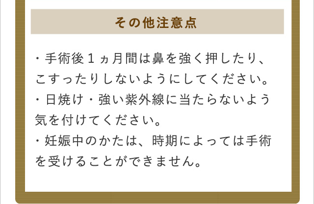 ★鼻先を高くしようとして強く絞り過ぎてしまうと、指で摘まんだような鼻先(pinch nose、polly beak nose)になってしまいます。この場合は糸で縫縮するときに、軟骨を少し削って形を調整します。