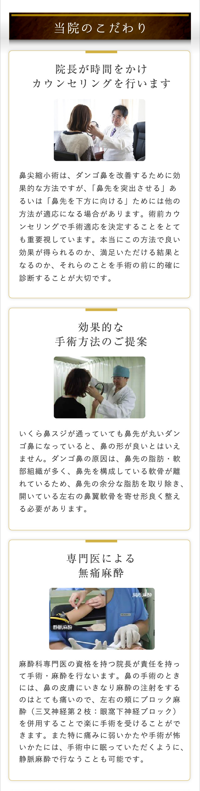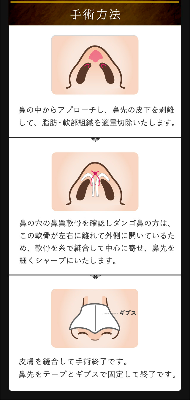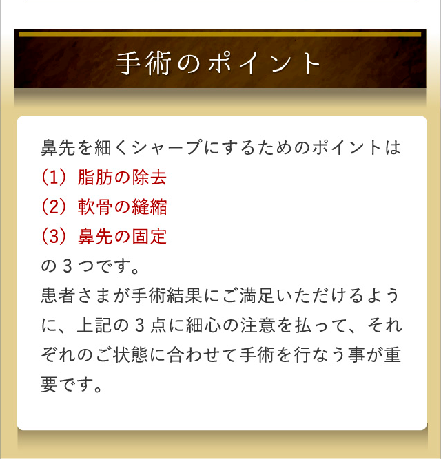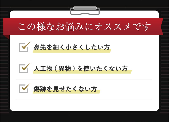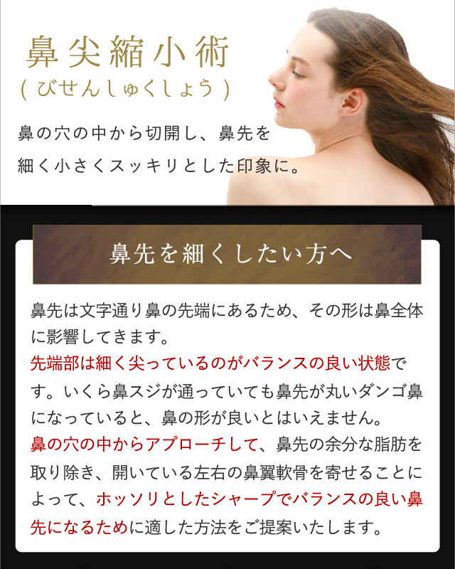 鼻尖縮小術は左右に広い鼻先を絞る手術になりますので、基本的には正面から見たときの鼻先が細くなります。横から見た状態では絞った分だけ、ホンの僅か鼻先は高くなりますが、ほとんど変わりません。鼻先を前方あるいは下方に伸ばす手術は「鼻尖部軟骨移植術」か「鼻中隔延長術」になります。術前のカウンセリングでご状態をしっかり確認して、適切な手術方法を選択することが重要です。